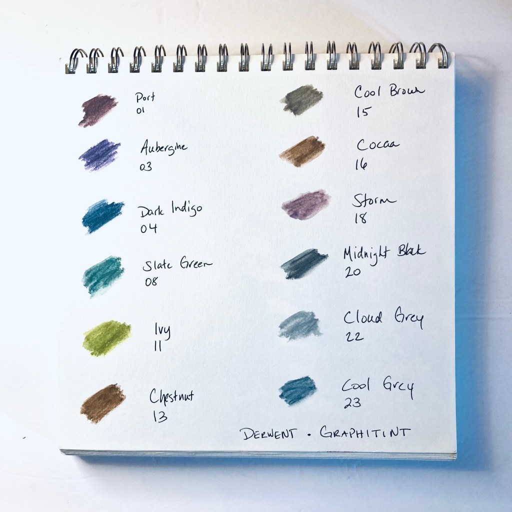 Below I have recorded some tints from different cases of mediums to be used for reference. I hope that these can help out when making some choices for experimentation or projects. The cases are of Derwent Inktense, Derwent Coloursoft, Fabre Castelle Art Grip Aquarelle, and Derwent Graphitint.