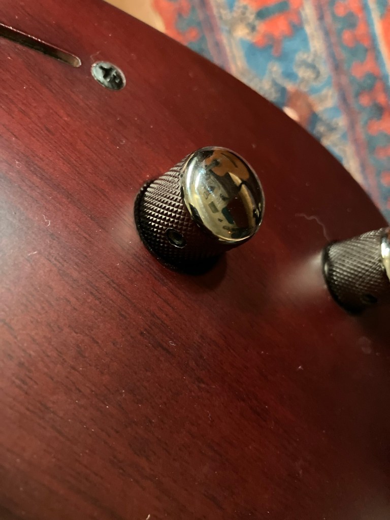 These hematite , pewter looking tone and volume knobs are our current focus because they kept rolling off or proving to be loose. The guitar was in great shape but looked like it had been sitting around unplayed and needed some TLC, common in this situation. You may be able to see a small hole in these knobs in the photo above. It has notches in it for a tiny tool , which I don’t have but improved. By taking a jumbo paper clip and some wire tools from my bead kit I was able to bend and squeeze a curved end that was strong enough to grab the tiny space inside and tighten it with a few delicate turns. That’s all you need, no force, just carefully securing them. The only other issue I had was low action, a subject I’ll cover more on as soon as I try it.