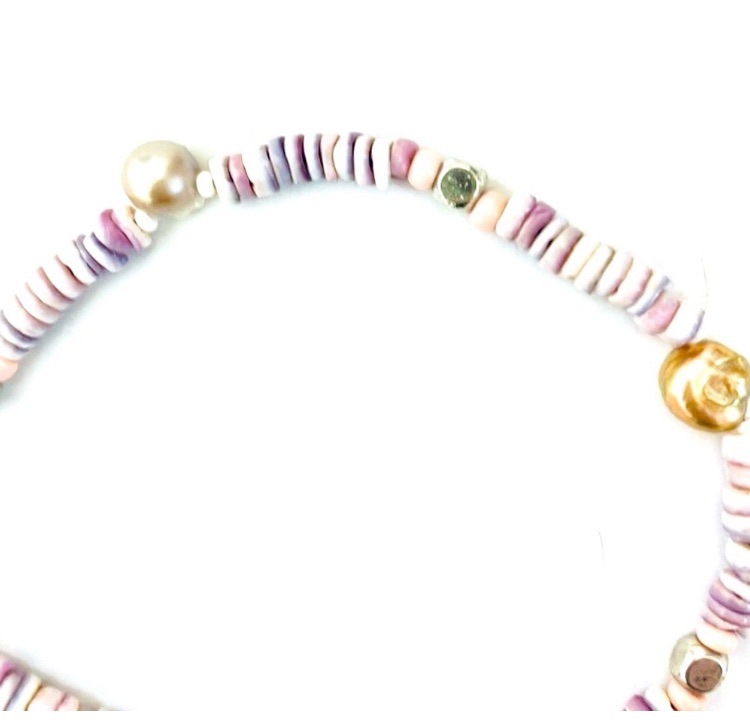 A sweet and soft pearl, shell and glass beaded bracelet with a cowgirl hat charm and tassel.