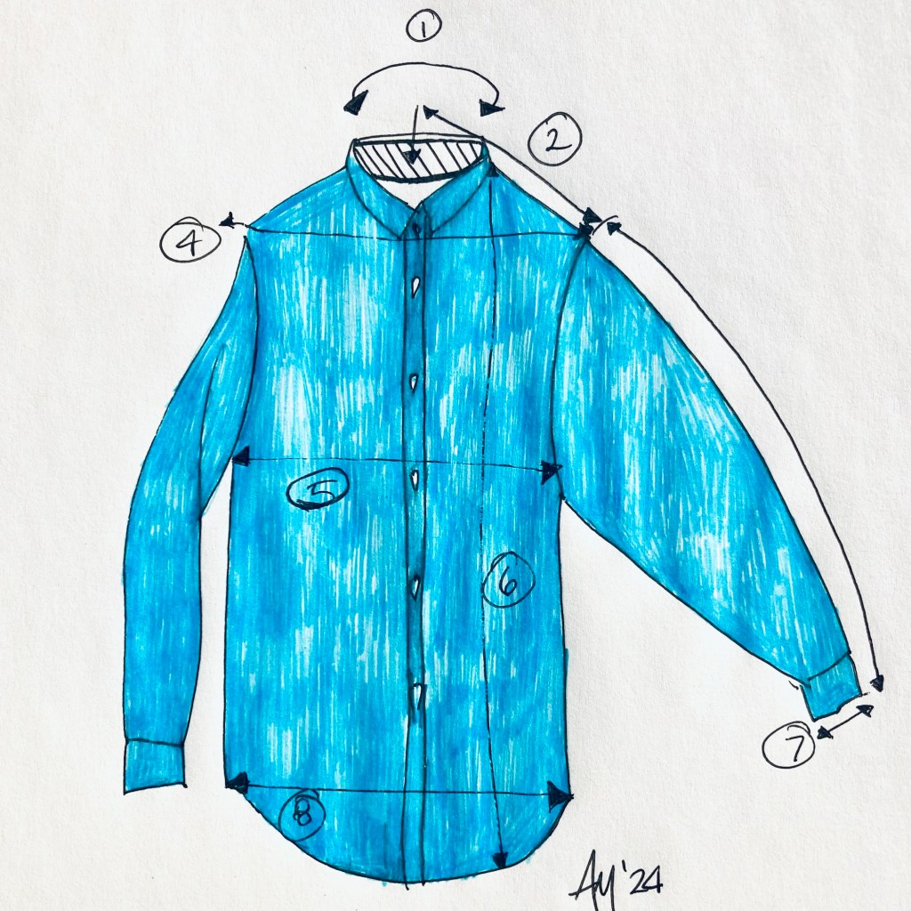 - Collar: Unbutton the shirt and spread it out on its back. Place one end of the measuring tape at the center of the button where the button stitching comes through to the inside of the collar band and measure along the collar up to the button.