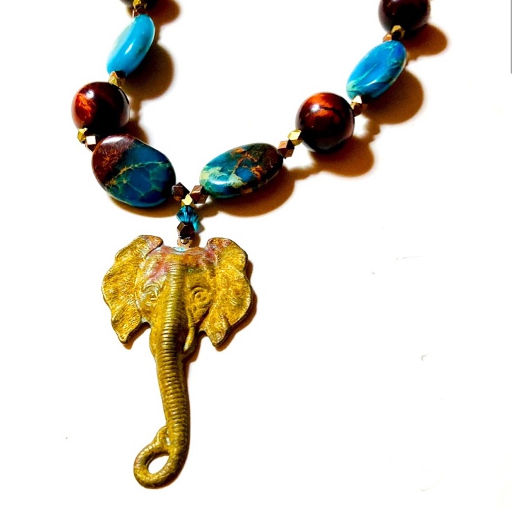 Another beautiful handmade patina pendant as focal point. Purchased from an artist on Etsy. This unique elephant blends with a very nice quality stone in aqua and browns. It is complimented with copper and bronze filler beads. Hammered toggle clasp. 20 1/2″ in length.