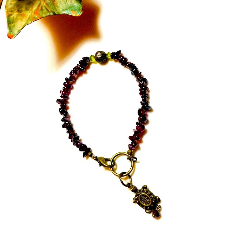 Beautifully rich in color, these garnet chips mingle with a sparkle of green peridot and a fun turtle harm for embellishment.