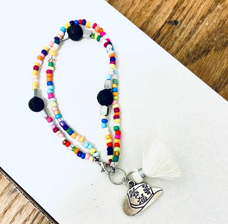 New double strand artisan bracelet, very colorful with seed beads and a cowgirl hat charm in metal. A white tassel compliments the designs.