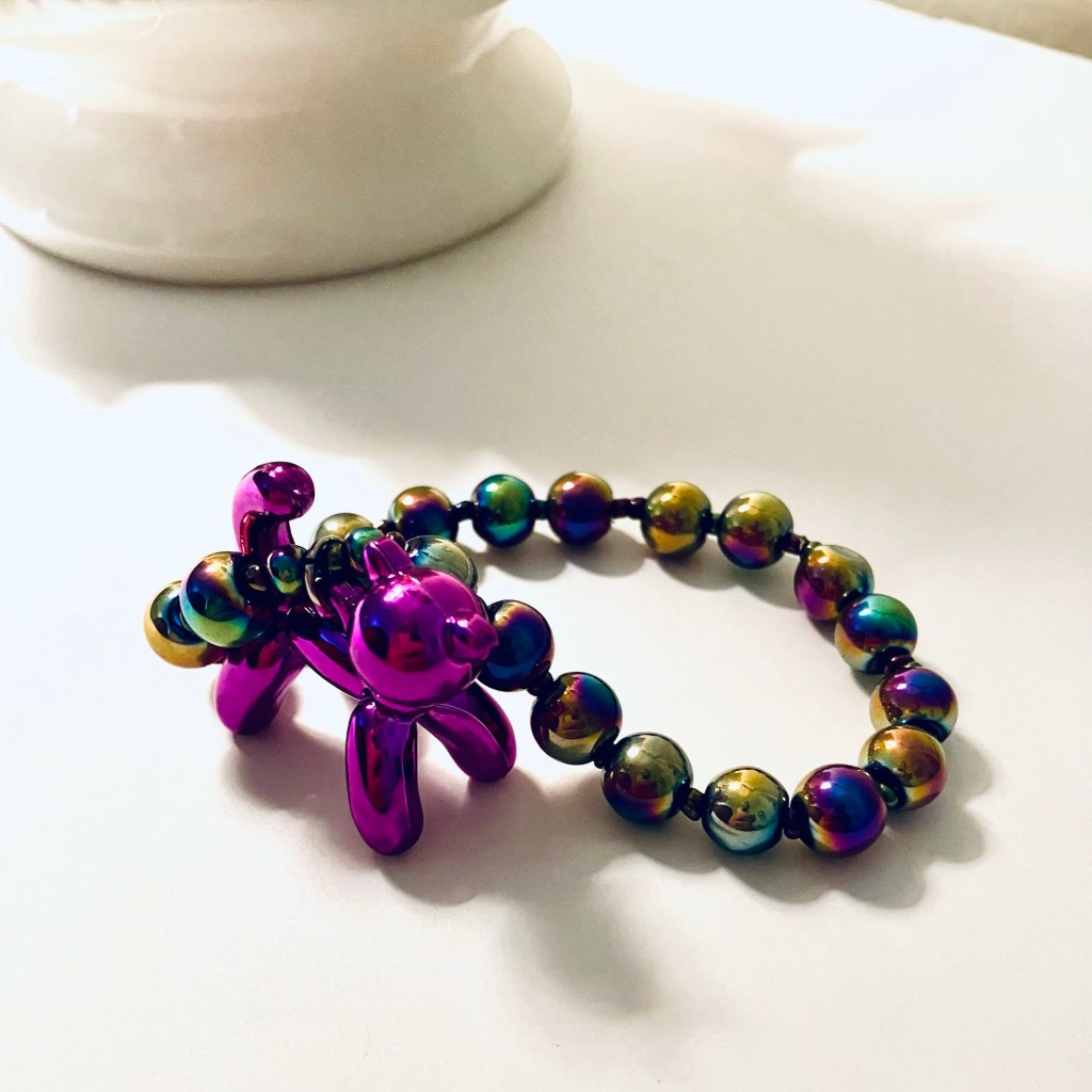 A funky fun purple balloon kitty focal is surrounded with color and comfort able lil slick beads.