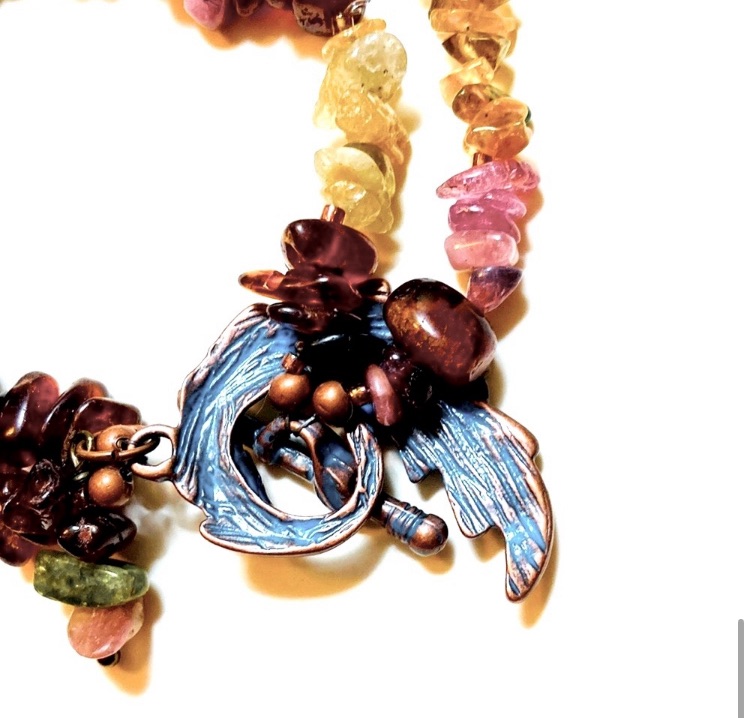 Fresh off the work table, this beautiful double stranded tourmaline bracelet is full of energy and a colorful, natural feel. It represents the tones of natural earth and atmosphere. Untouched and organic. A little glam is added with iridescent seed beads and it is finished off with a copper and blue leaf toggle clasp.