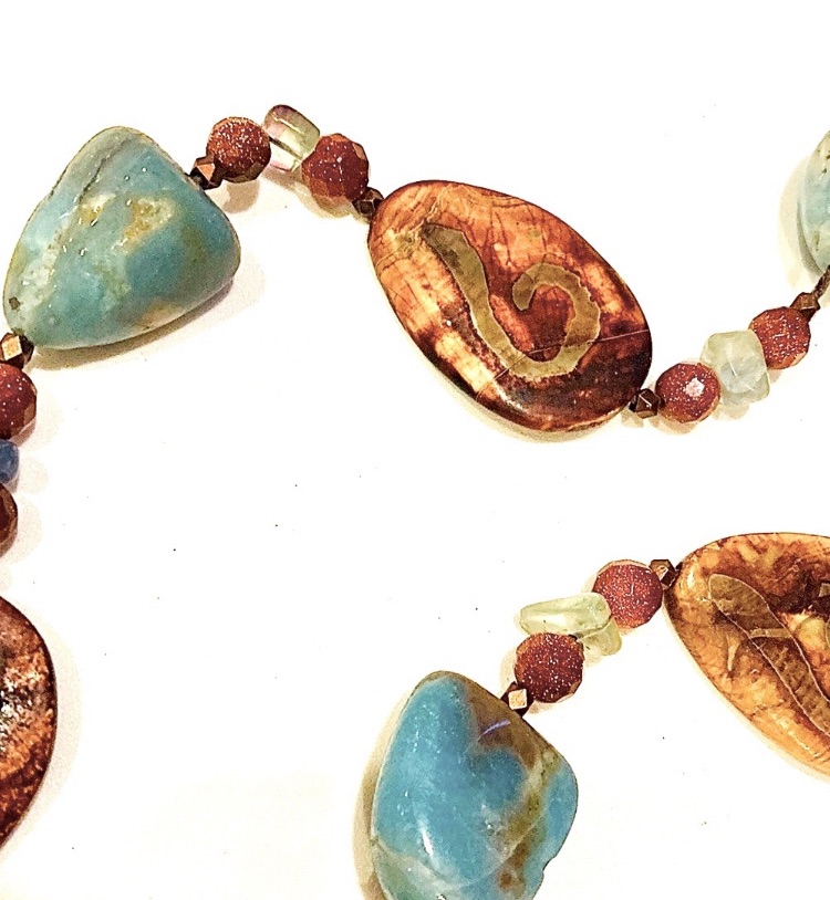 This gorgeous horse pendant had such a special vibe when I bought him. The design came to mind very easily, with very nice quality natural stones. Seafoam green Aqua shades mixed with browns, copper, goldstone, and bronze. The clasp is a large toggle that handles the strength of the horse. He tells s story of being strong, making it through the battles of life, and coming forward with integrity and passion. The horse is bronze gold and has a Greek flavor to him. Supported by waxed thread.