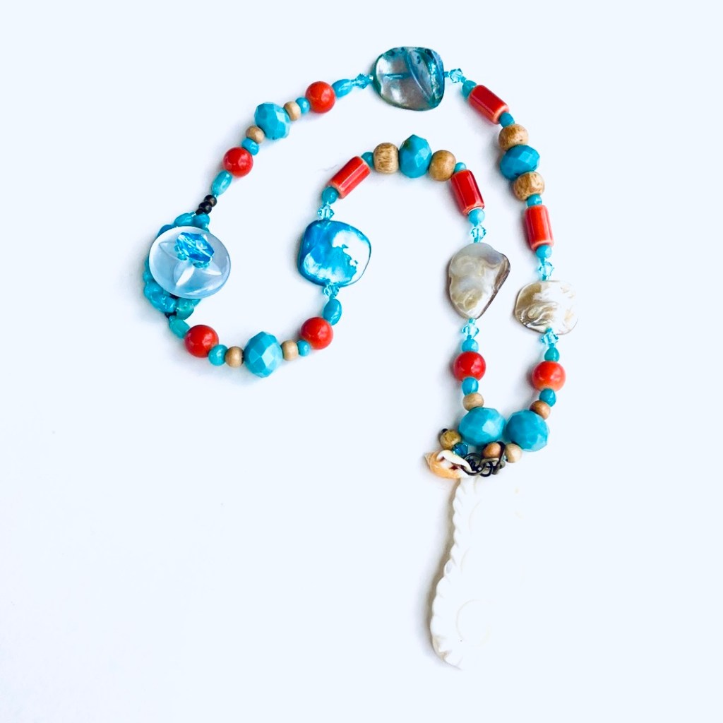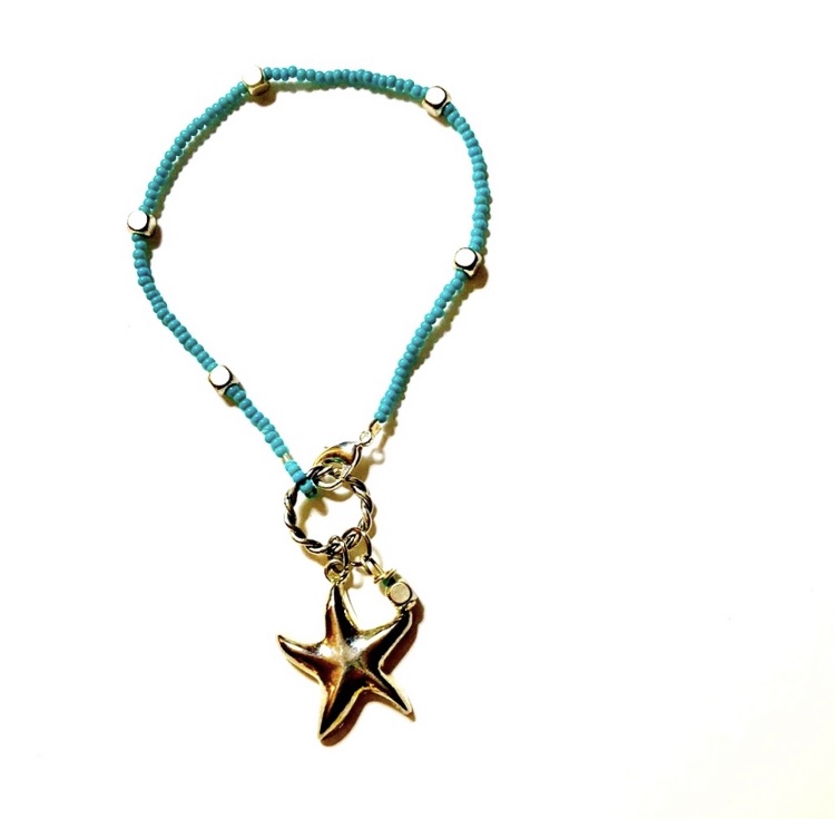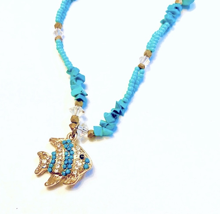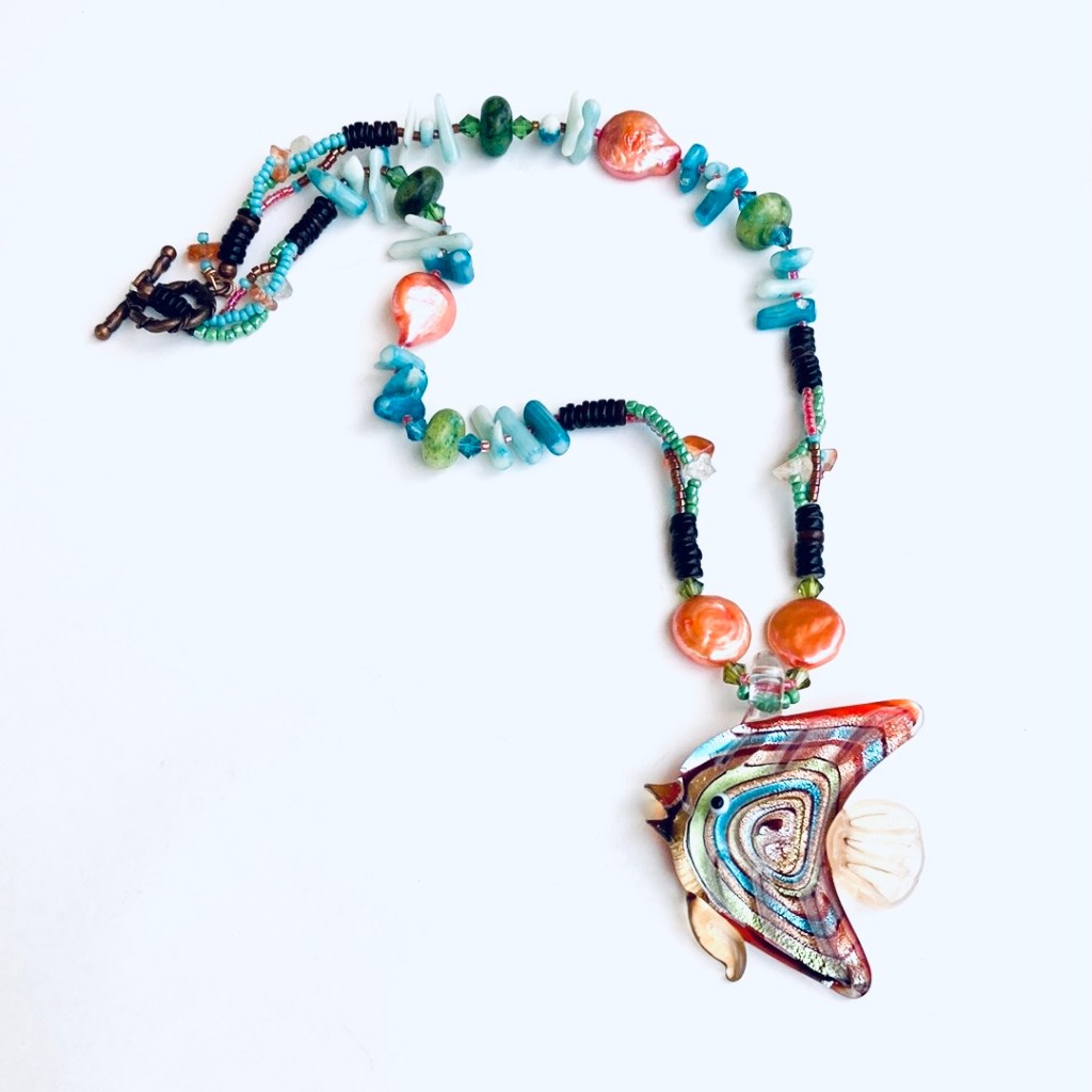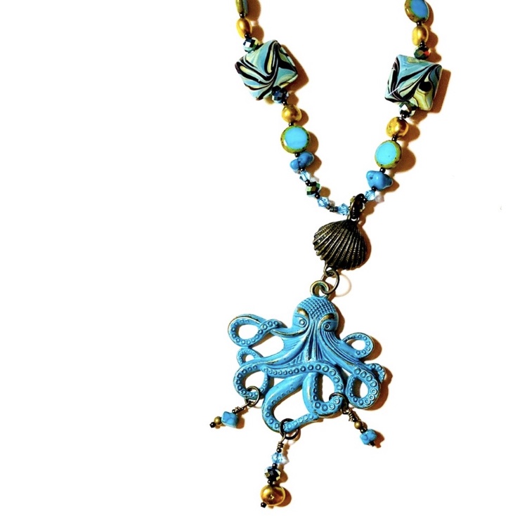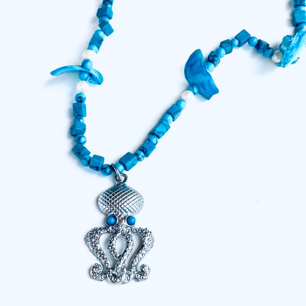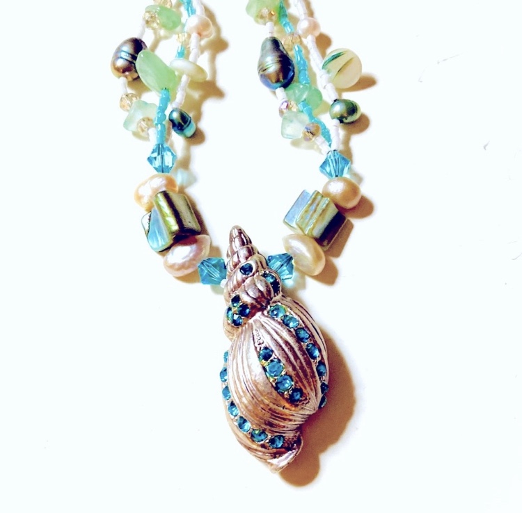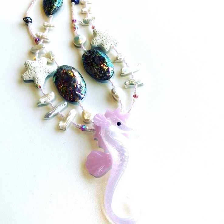 An underwater treasure of glistening glass, pearls, and friends of the sea. Perfect for your summer evenings.